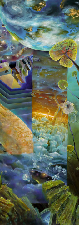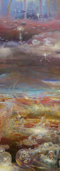 The purpose of their large scale is to elicit in the viewer a sense that the paintings themselves are doorways, creating the experience of a space filled with portals into other times and dimensions that invite the mind to enter.
